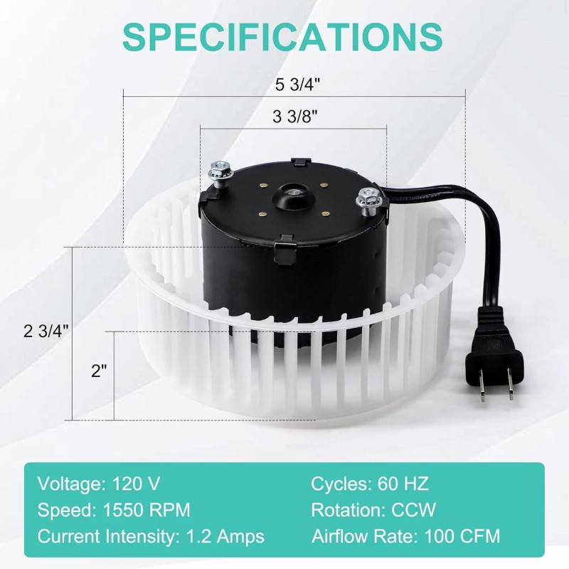 - ► Parameter of Nutone Exhaust Motor - 3 7/16'' Dia x 2 3/16'' H Motor, 5 5/8'' Dia x 2'' H Blower Wheel. 2-Prong Plug, Shaft Rotation: CCW, Voltage: 120V, 1.2A, 60 Hz, 110 CFM, 1550RPM, 0.02HP, Class B, Max.Amb 40℃, Thermally Protected.