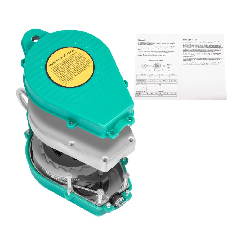 - Before using the fall arrester, you should check the rope and appearance, and test lock 2-3 times (test lock way: pull out the safety rope at normal speed and should make a "tah, tah" sound; when you pull the rope with force, it should be able to lock. The rope should be able to automatically recover to the device when released. If the above situation does not appear, please stop using it immediately.)