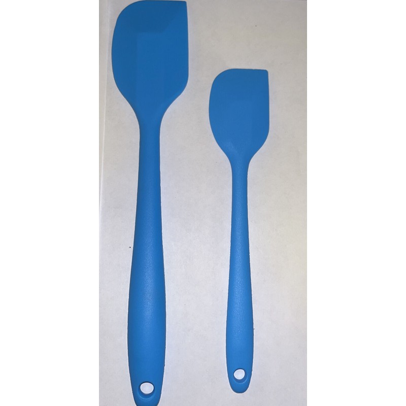 Large spatula is 10 3/4 long and small spatula is 8 1/4 inches long. PLEASE NOTE: Some of the smaller yellow spatulas are a darker yellow shade than some of the others. Set contains two blue and two yellow spatulas. These are sturdy, nice spatulas.