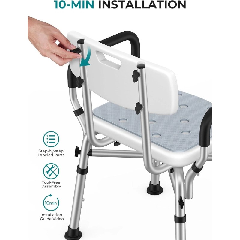 - TOOL-FREE ASSEMBLY IN 10-MIN: The instructions for shower chairs are straightforward! Tool-free assembly with clear directions and labeled parts of tub seats for seniors, as well as a detailed video installation guide, in just 10 mins