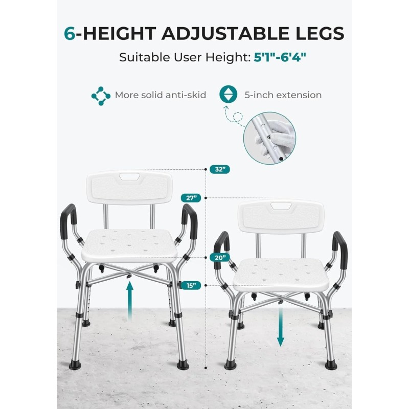 - 6-HEIGHT BATH SEAT: Easily adjustable to six heights (27.5" to 32.5"), the bariatric shower chair with arms and back fits users from 5'3" to 6'5", offering more comfort and support than a shower stool/shower bench, meeting the needs of all age groups