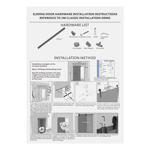 It is suitable for doors with a thickness of 1-3/8- 1-3/4", a width of 26-30'' and a weight of no more than 330 lbs. It can be widely used in barns, stables, bedrooms, dressing rooms, garages, and so on.