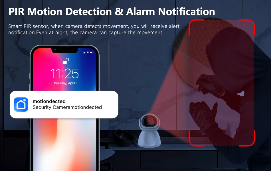 - PIR Motion Detection. High sensitive motion sensor, APP push instant notification.