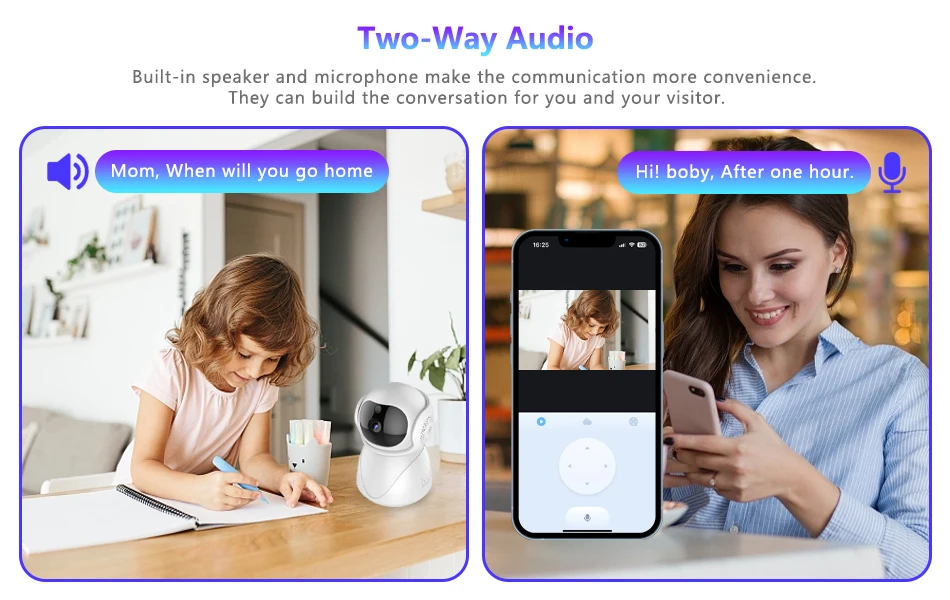 - Two Way Audio. Built-in Mic and speaker, talk with people in real-time