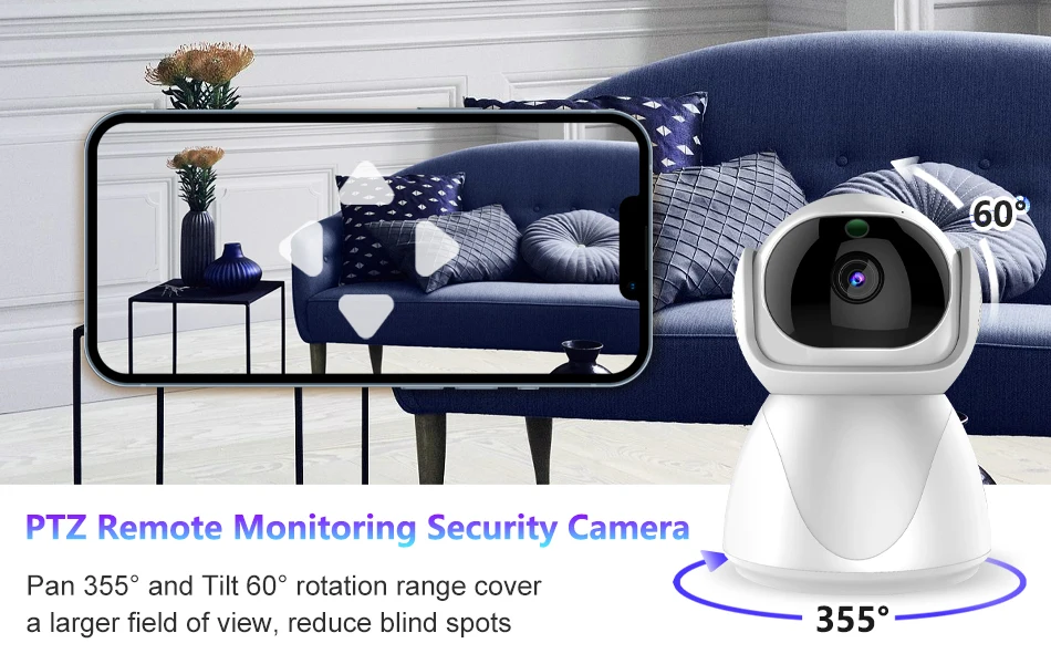 Pan/Tilt/Zoom: View 355° horizontal, 90° vertical rotation range through Mobile Phone, which cover more spaces and reduce blind area