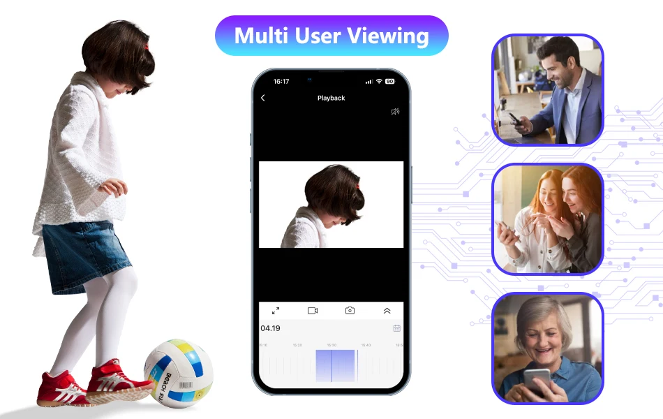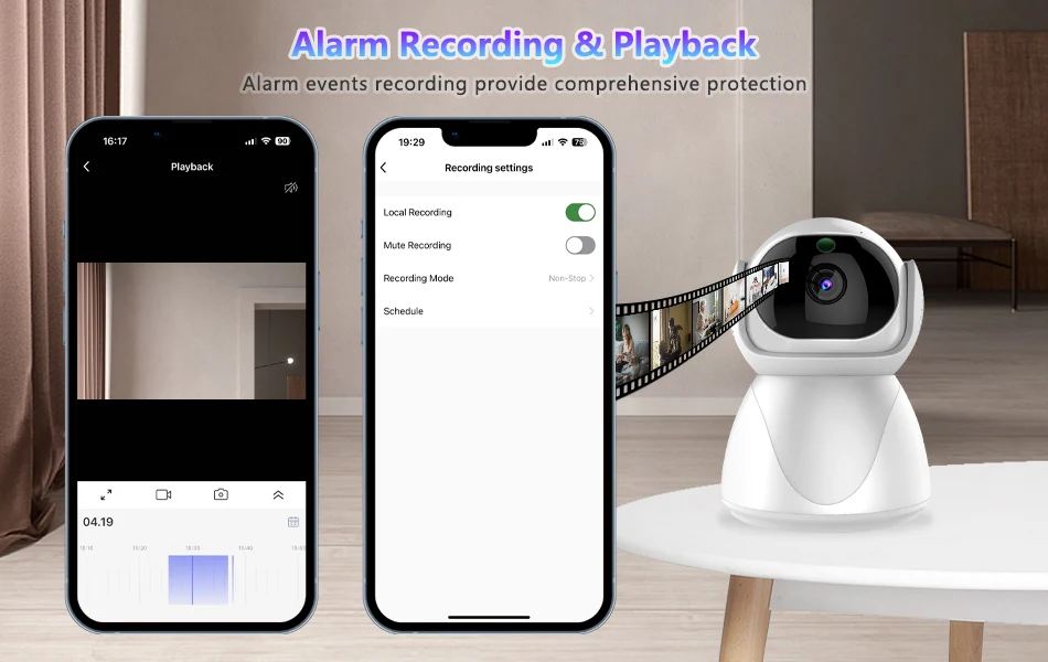 This indoor WiFi camera support alarm events recording and all-day recording. You can view the video playback by dragging the timeline