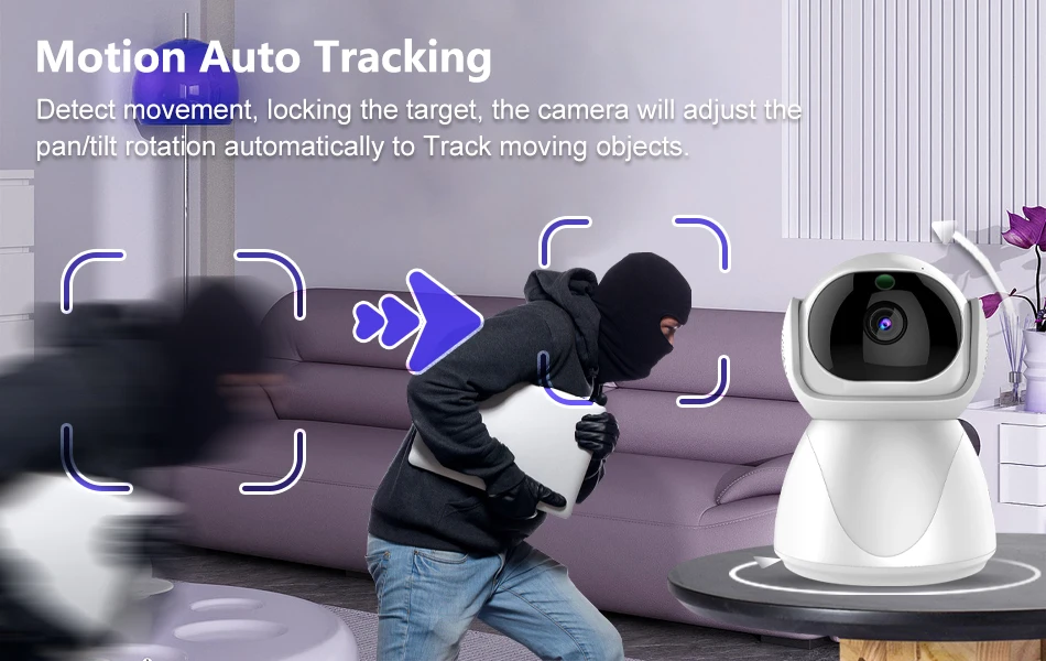Monitoring a wider area. The camera has automatic tracking function, it can follow the human movement to change the monitoring area. You can open or close this function on APP.