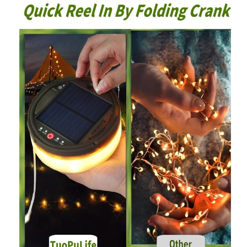 - 【Compact & Easy to Store】- Quickly turn the handle and the camping lights can be restored by the manual device in only about 30 seconds. String lights for camping ingenious design ensures seamless storage and easy packing.