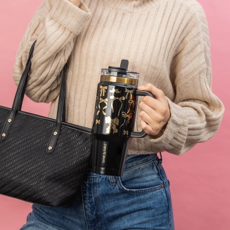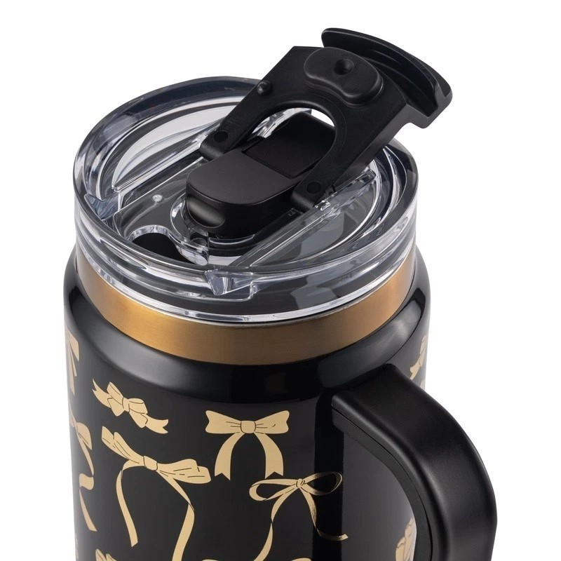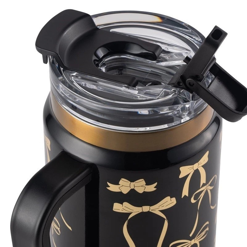 32oz Tumbler with Handle, Dual Straw Lid, Stainless Steel Double Wall Insulated, Black & Gold Bows