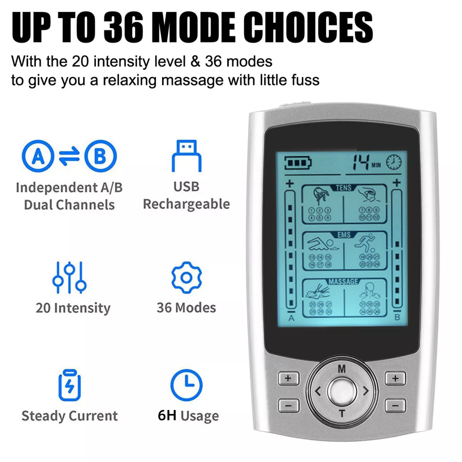 2. 36 Modes & 20 Adjustable Levels: This Tens Unit Is Equipped With 36 Massage Modes (Beat, Massage Therapy, Scraping, Back Massage, Kneading, Acupuncture, Cupping, Neck And Shoulder Massage, Tai Chi), Each Group Has 20 Levels Of Intensity, Allowing You To Easily Find One That Meets Your Needs Settings To Relieve Pain (Lower Back, Arms, Joints).