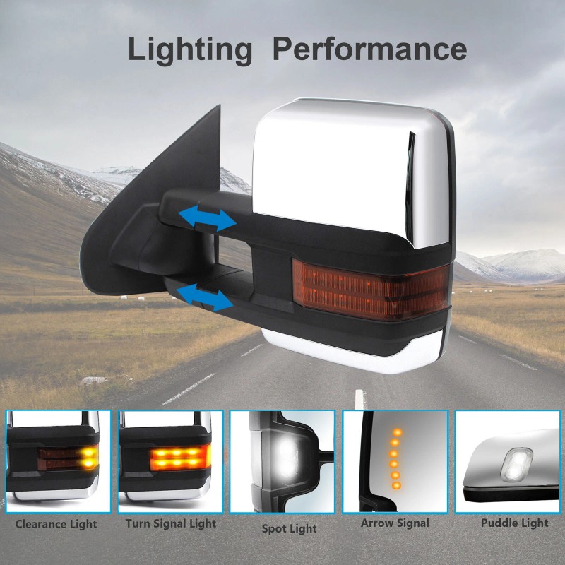 - Features: Amber Lamp Housing, Arrow Light On Glass, Auxiliary Light, Extendable, Puddle Light, Spot Light, Turn Signal Indicator