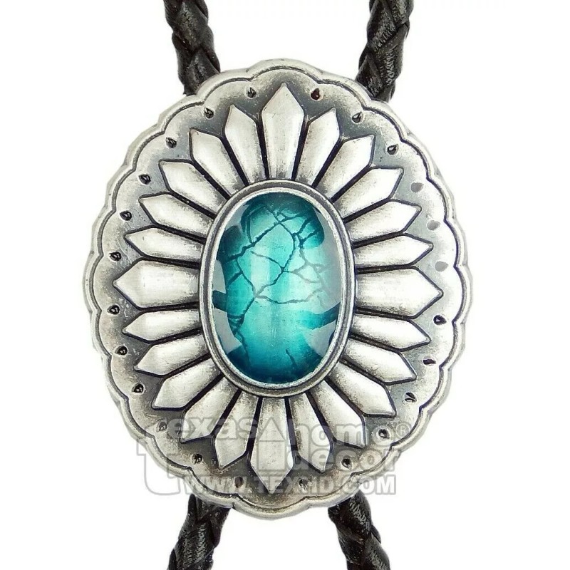 Unbranded Turquoise Oval Bolo Tie Real Silver Plated 38" Adjustable Genuine Leather Cord