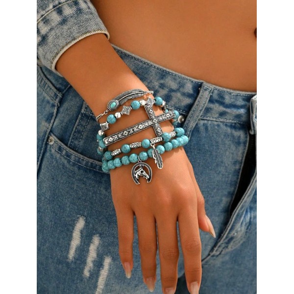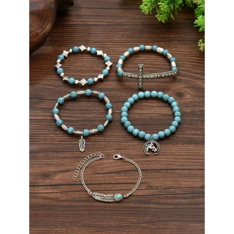 Unbranded Turquoise & Silver Western Stack Bracelets with Charms (5 Pieces)