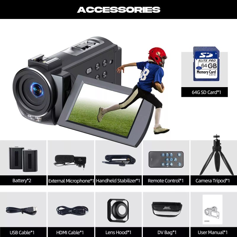 5k Camcorder x1;64GB SD Card x1;Handheld Stabilizerx1;2.4G Remote Control x1;External Mic x1;Battery x2;DV Bag x1;Lens Hood x1;USB Cable x1;User Manual x1
