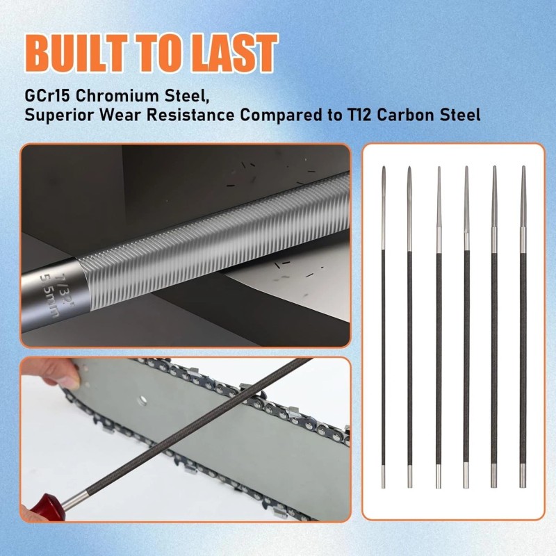- Premium Chainsaw Sharpener File Kit Construction – Crafted from high-chrome GCr15 steel, these round files in our chainsaw sharpener file kit offer superior durability, outlasting ordinary T12 carbon steel chain saw file alternatives.