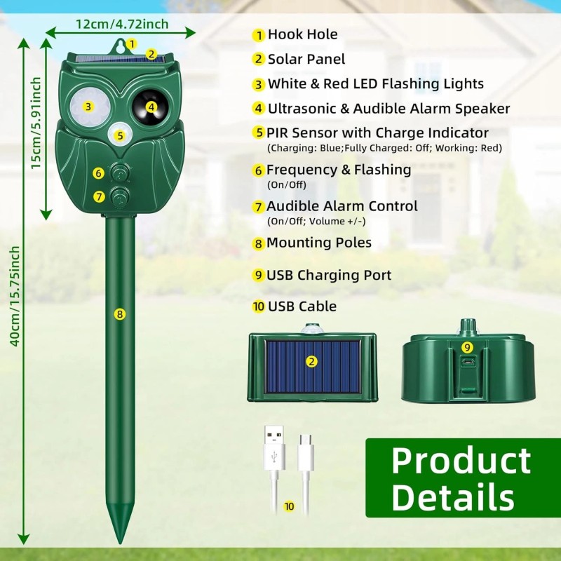 - This ultrasonic animal repellent features advanced dual-chip technology, emitting alternating ultrasonic waves (13.5-45.5KHz) and LED strobe lights to disrupt animal vision and auditory systems, effectively driving them away. With 5 adjustable sensitivity modes, it covers 20-25 feet within a 110-170° range. Ideal for yards, gardens, farms, and more, it humanely deters nocturnal animals like deer, raccoon, skunk, cat, dog, rabbit, squirrel, fox other nocturnal animals