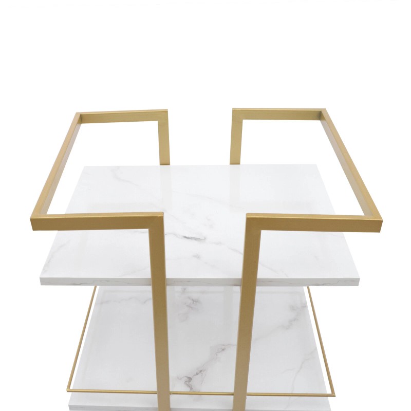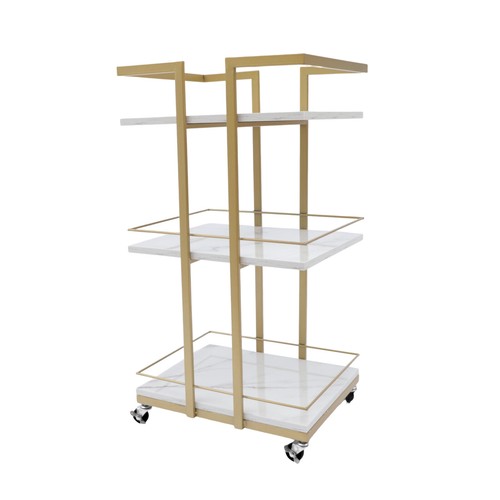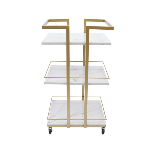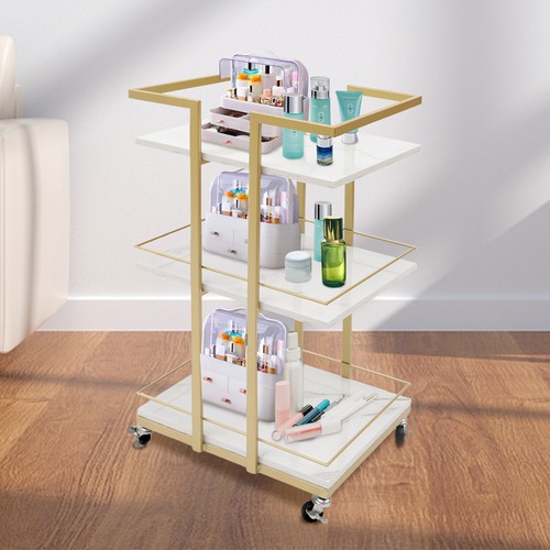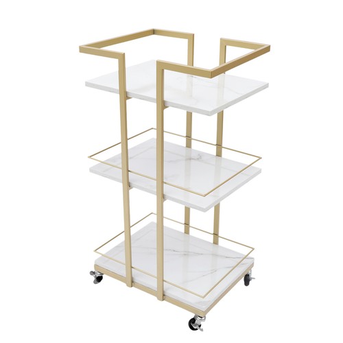 Specification Material: Iron+Wood Color: White+Gold Surface Treatment: Baking Paint Packing Size: 44*34*75cm/17.32*13.38*29.52in Product Size:43*35*80cm/16.93*13.78*31.5in Pipe Wall Thickness: 0.8mm/0.031in Gross Weight: 7kg/15.43lbs Net Weight: 6kg/13.22lbs Load-bearing Capacity: 25 kg/55lbs   Package Included 1* Bar Cart     Application It can be widely used in the kitchen, living room, studio, bedroom, balcony, etc. to store cosmetics, snacks, toys, books, toilet paper, and other items.