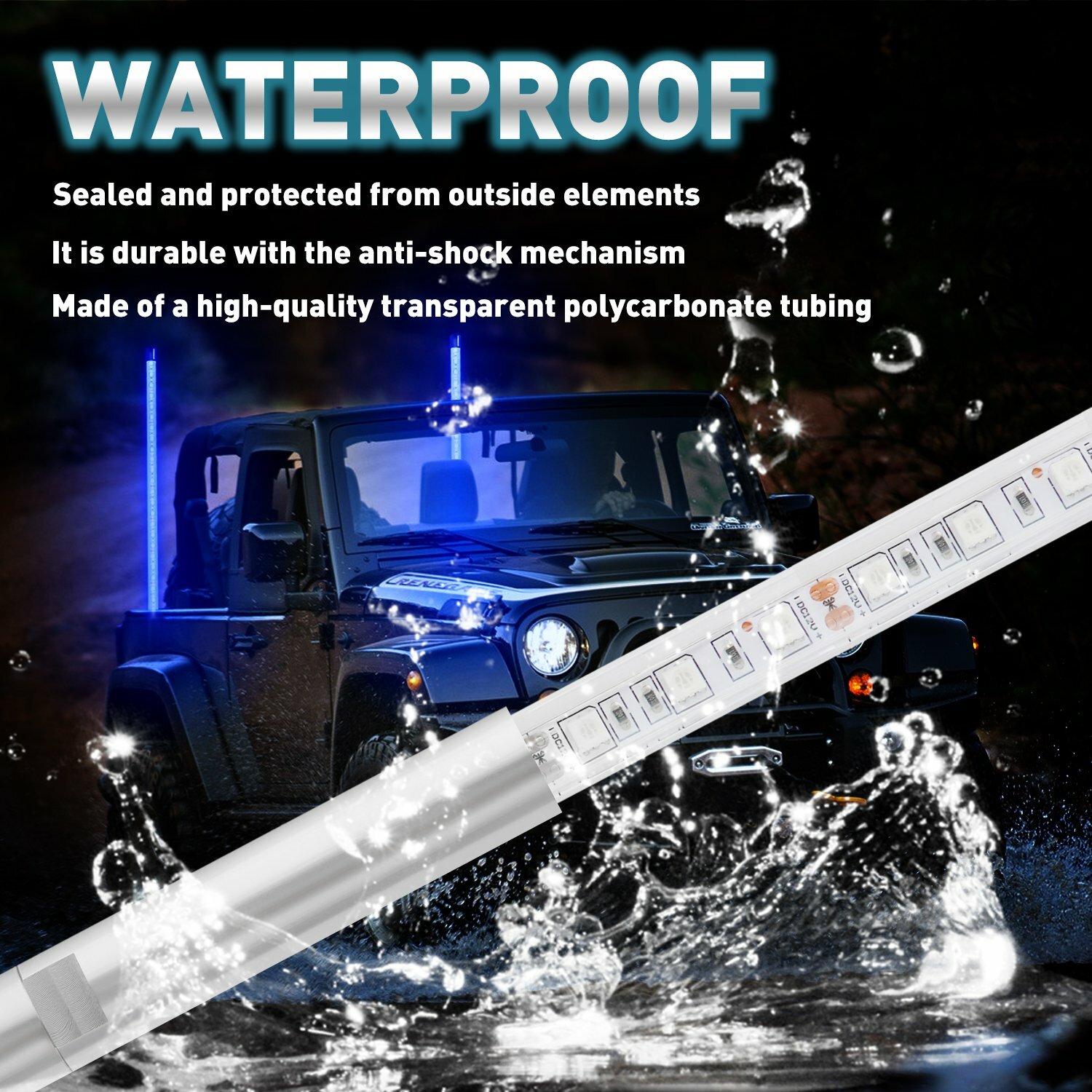 • Made of a high-quality transparent polycarbonate tubing and waterproof silicone insulating material, the lighted whips are flexible and bendable up to 180°. It is durable with the anti-shock mechanism, decreasing mechanical damage.