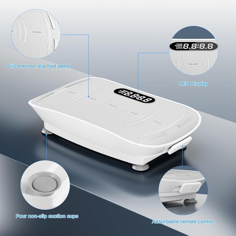 - User-Friendly: Vibe plate uses ABS plastic, which is very durable and stable, and can increase the service life of the shake plate. The bottom of the fitness platform is designed with suction cups, which are non-slip and fit the ground better.After the vibration platform machine starts vibrating, it can reach a relatively quiet state of 22-49dB, which avoids a lot of troubles when using it.