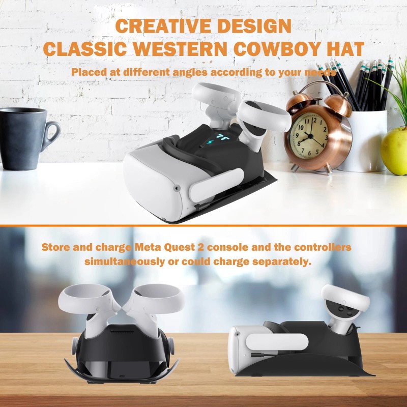 2. Featuring made and decent design: The appearance is western cowboy top hat shape, unique and generous, easy to use, can simultaneously charge two VR controller and a VR console, or can separately charge VR host or VR controller.