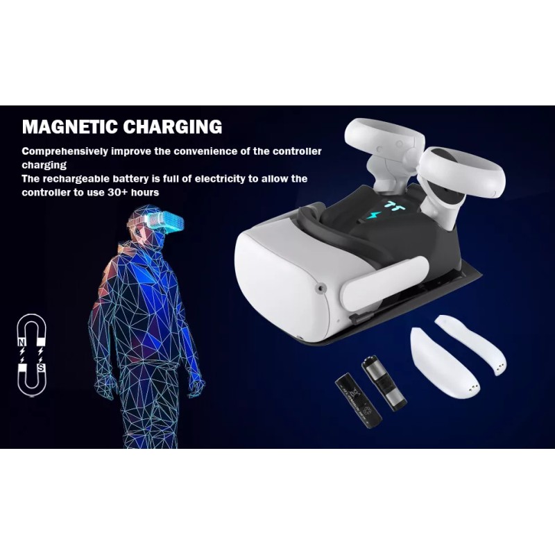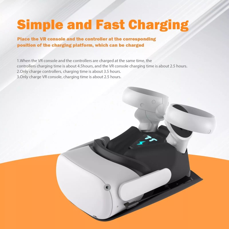 3. Fast charge for Oculus Quest 2/ Meta Quest 2: The Quest 2 host takes about 2.5 hours to fully charged and the Quest 2 controllers fully charged within about 3.5 hours. When charging the host and controller at the same time, it will prolong the charging time.