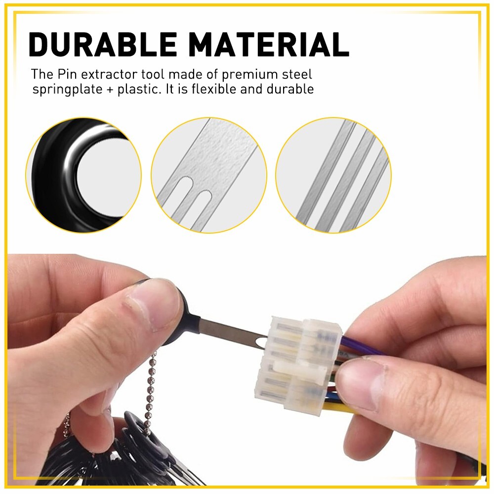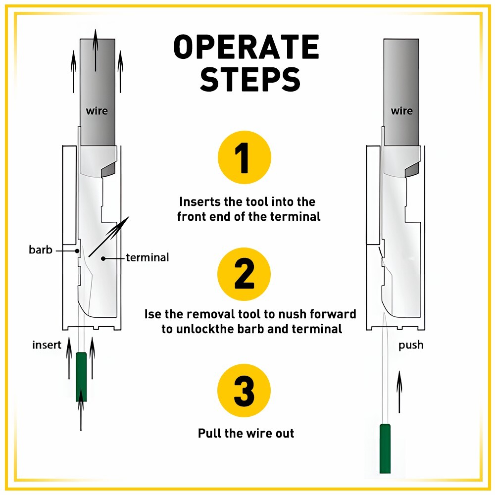 The electric needle removal tool is easy to use, push and pull the terminal pin with the connector needle removal tool, you can effortlessly remove from the wire harness connector without causing any damage.
