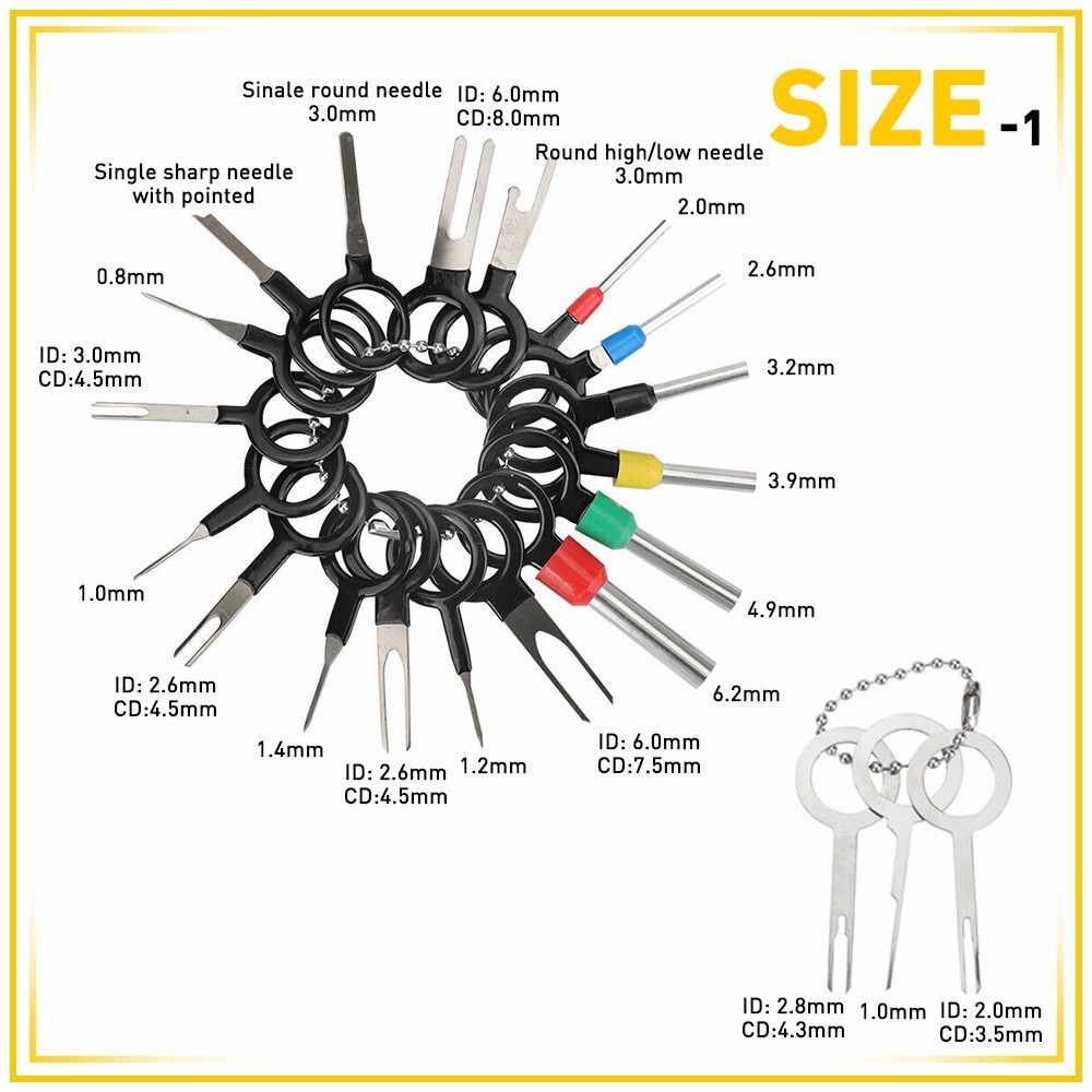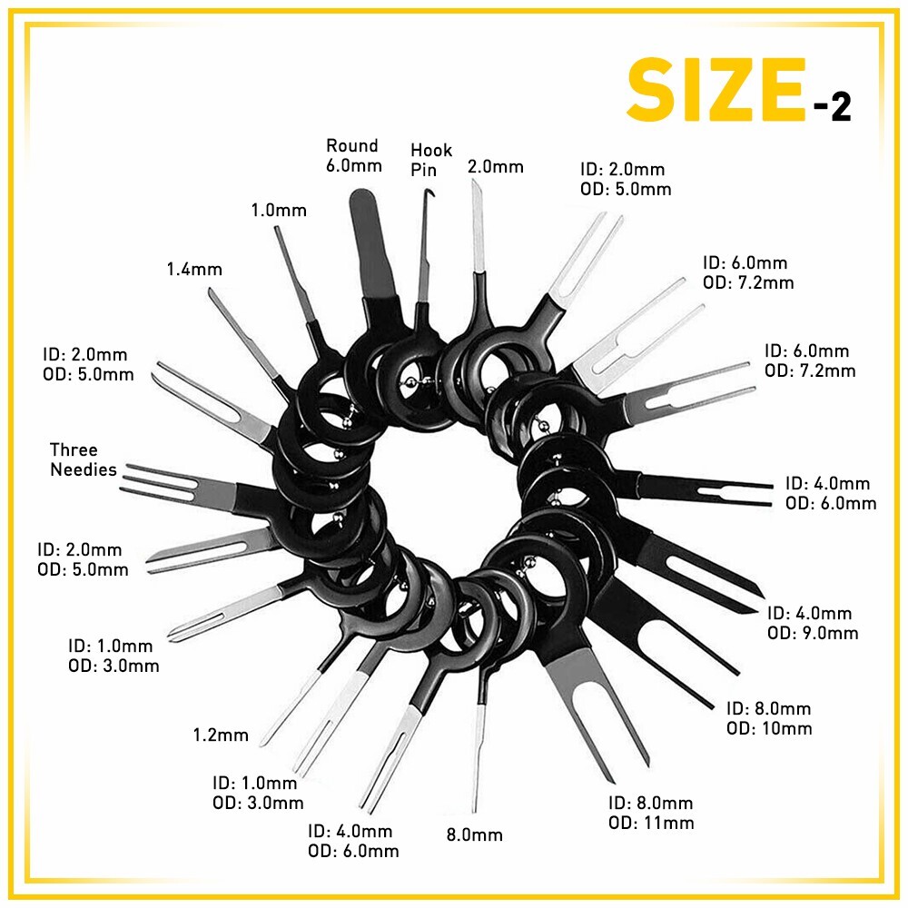 Specification: Material:Stainless steel+plastic Size: 1.Single-pin Width 0.8mm, 1mm, 1.2mm, 1.4mm, 3mm, Single needle tip. 2.Double-pin Inner(outer) Diameter 2mm(3.5mm), 3mm(4.5mm), 3mm(8mm), 4.5mm(6mm), 6mm(7.5mm), Double needle with round. 3.Casing Diameter 2mm 2.5mm 3mm 3.9mm 4.9mm 6.2mm Application: Ideal for various connector terminals in automobiles, motorcycles, and electronic vehicles, this terminal ejector kit is versatile and reliable.