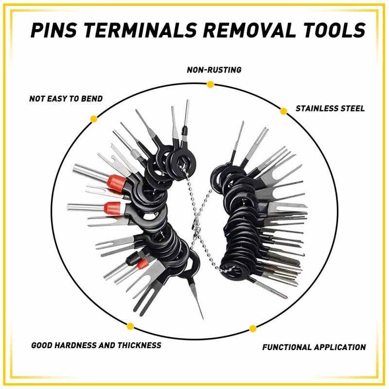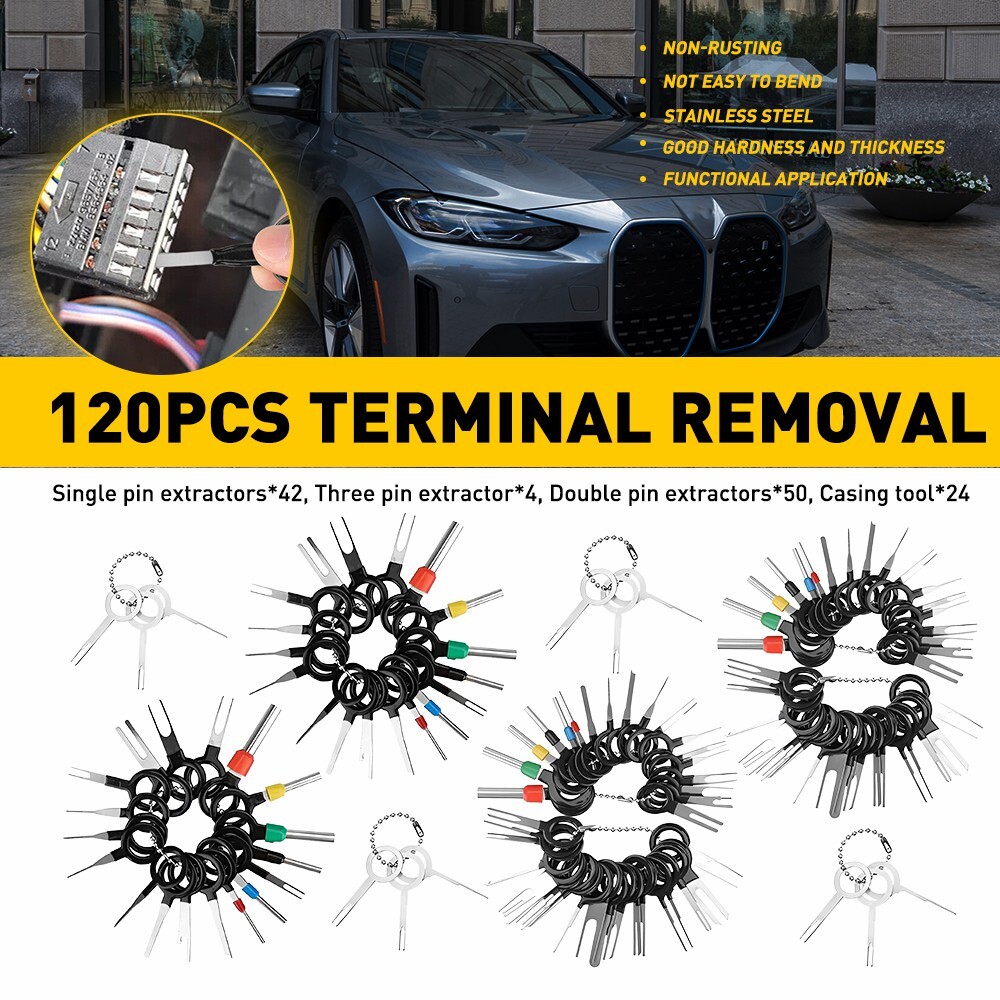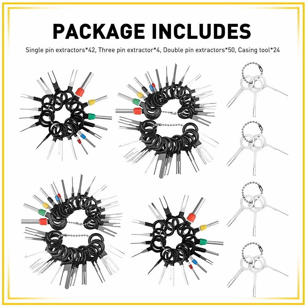 single pin extractors*42 three pin extractor*4 double pin extractors*50 casing tool*24 (120pcs Terminals Removal Tools in total)