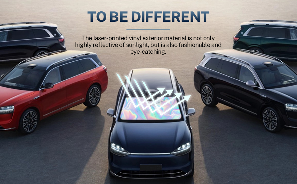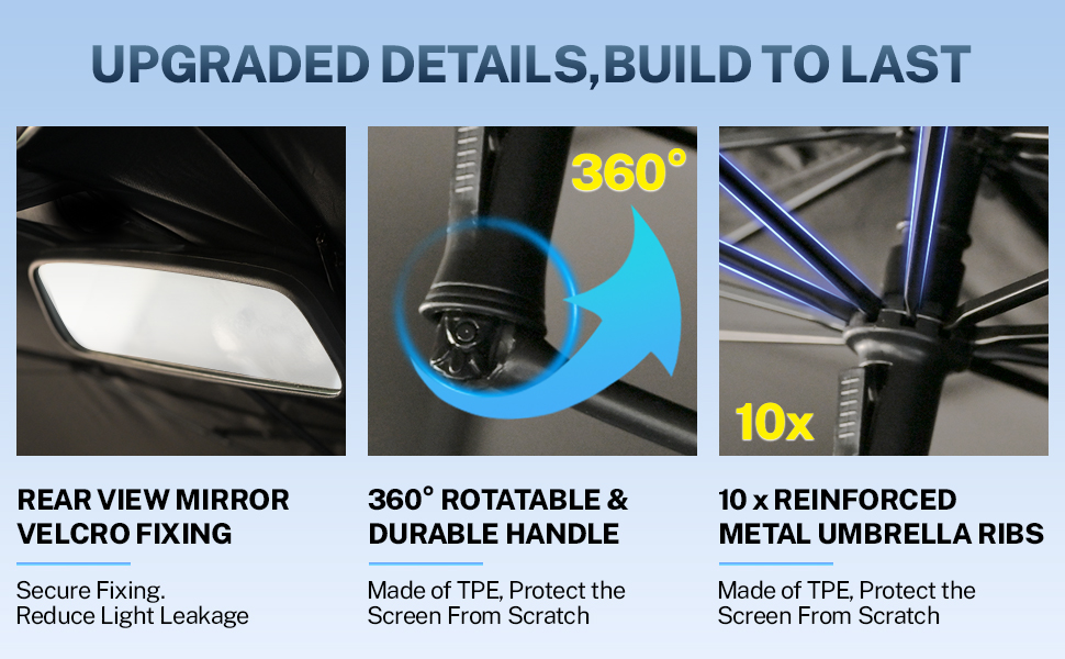 [Certain upgraded designs for the umbrella]: first, a slot is designed on the upper side of each umbrella. This slot allows the umbrella to fit perfectly to windshields or windscreens with rear-view mirrors. Secondly, the umbrella handle is 360 degrees rotatable and bendable. Most car sun umbrellas cannot be rotated through 360 degrees or bent. However, our car sun umbrella handles are made from soft plastic and can rotate through 360 degrees and bend, which provides better protection for your car's centre console and dashboard from scratches.
