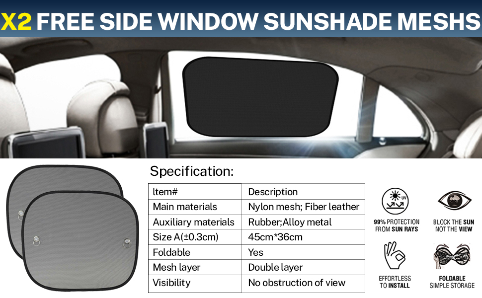 - Package includes:: 1 x windshield umbrella; 2 x side window mesh sunshades
