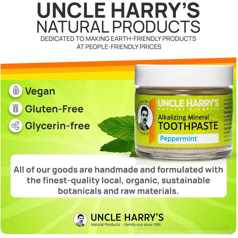- CLEAN & QUALITY - Uncle Harry's oral care remedies are proudly SLS free, gluten free, glycerin free, fluoride free, and vegan to meet even the most sensitive and conscious tooth needs. Our 100% natural toothpaste products are also made without synthetic preservatives like foaming agents, colors, artificial flavors, or baking soda.