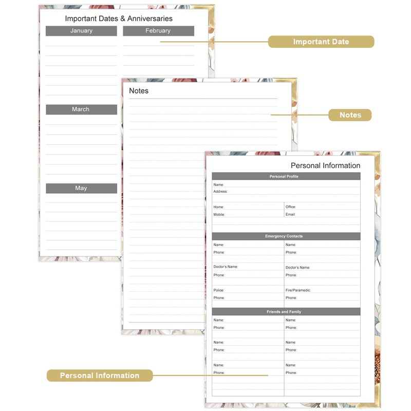 - 224 SHEETS / 448 PAGES - This undated planner measures 5.8 x 8.5 inches, a comfortable size for daily use and carrying. The planner notebook includes a Yearly Overview, Personal Information, Contacts, Important Dates, Monthly Pages, Daily Pages, Notes Pages, and a festival overview page covering 2025-2027. It comprehensively contains everything needed for daily use.