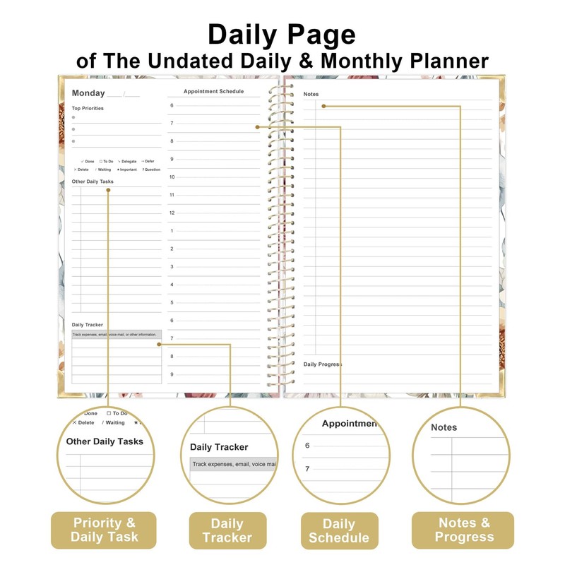 Undated Daily Monthly Planner for 2025 2026 - A5 To Do List with Hourly Schedule, Hardcover Spiral Bound Daily Planner to Increase Focus, Stylish School/Office Supplies, 5.8" x 8.5", Flower
