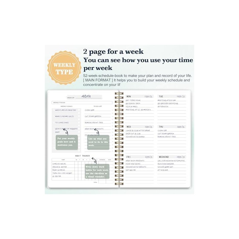 • 52 Week Undated Planner:This weekly planner features space undated weekly planner, weekly focus, weekly goals, weekly to-do list, habit tracker and notes. Undated to help you organize your week and year(52 weeks).Write down and prioritize your Weekly goals & to do list and then assign tasks to each day for maximum efficiency