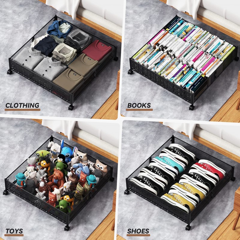 - [Quality Metal Container] Never settle for flimsy plastic&linen under bed storage bins which rip all too easily. This under the bed storage container is completely made of metal, compared with other under bed storage bins, smaller mesh size of the shelf is used for a larger load-bearing capacity. Plus, the whole frame was welded into a whole that never falls apart.