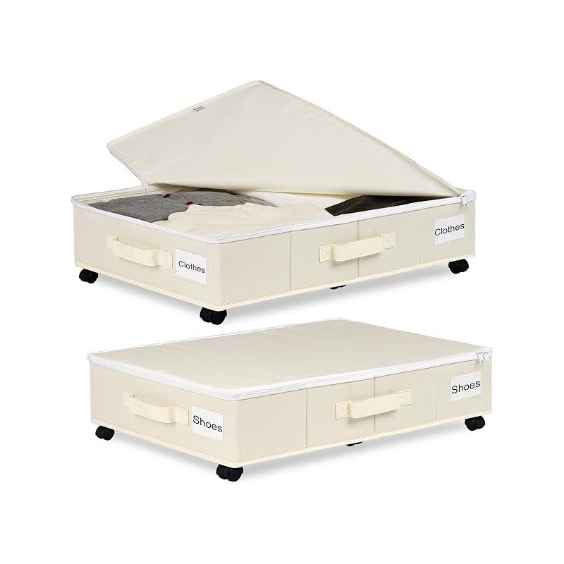 Under Bed Storage with Wheels, 2 Pack Under Bed Storage Containers with Label Holders for Clothes, Shoes and Blankets, Rolling Underbed Shoe Organizer with Cover, Beige (30.71x15.7x7.28 in)