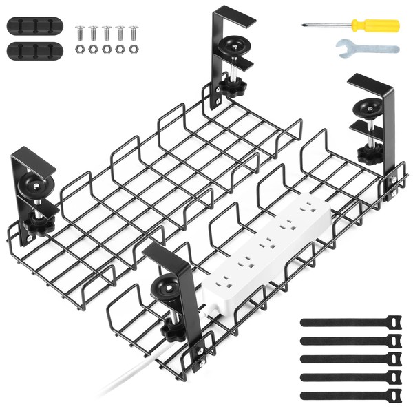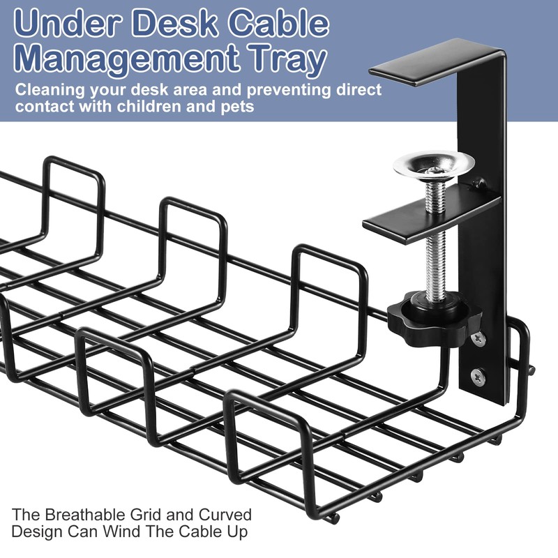 Cable Management Tray Under Desk, Wire Management No Drill, Under Desk Cord Organizer with Clamp No screws and no marks on your desk, just clamps. Keeping cables hidden from view is something numerous people struggle with, especially in a home or office. Large Cable Tray helps with managing messy wires and power adapter that plague today's work desk. Have everything is tucked under effortlessly and regain precious desk space to boost productivity and make you feel good. Perfect for entrepreneurs, small offices, and corporate offices. Made from a thick, 3 mm wide steel for a durable platform, it can hold power strips, power adapters, and various cables to help keep wires in order. The minimalist design and color will match most desks and instantly add a splash of style to your work space if it can't be hidden.