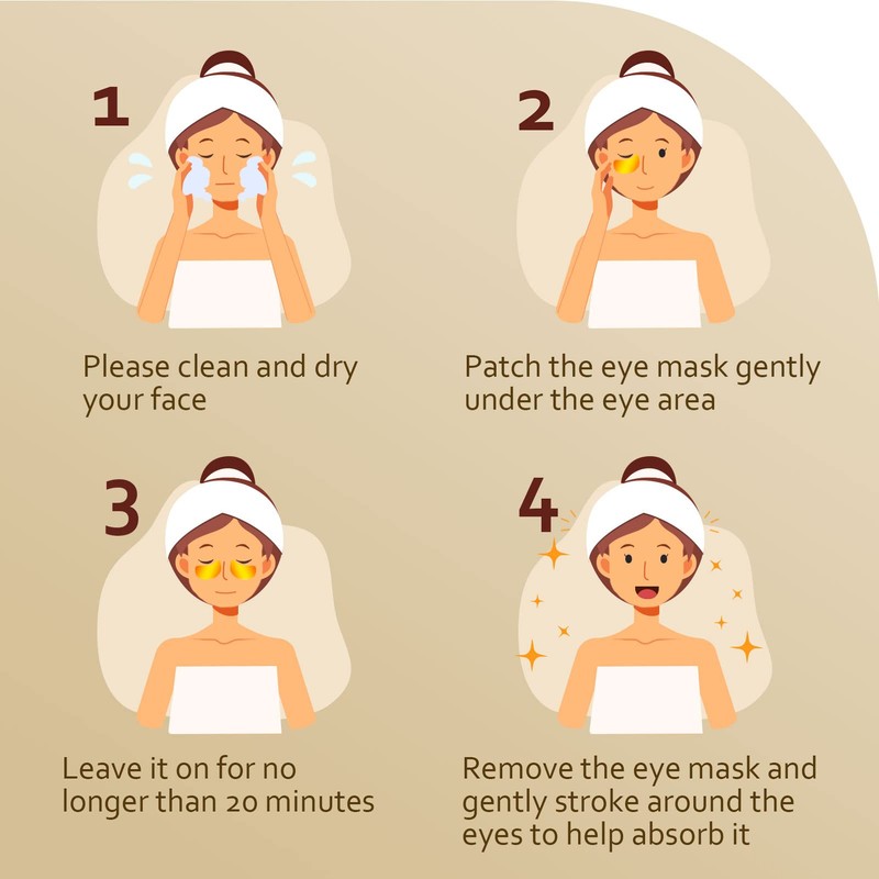 - Easy to Use: Clean your face and eyes with warm water, then put the eye patches under your eyes and press gently to secure them. Keep it for 20 minutes, and then remove the eye patches and gently pat the remaining essence. Twice a day or at least once a week.