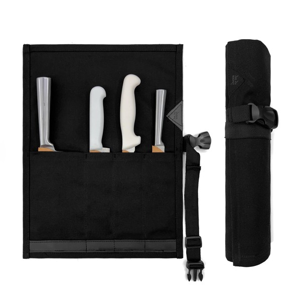 Under NY Sky Knife Roll Case - 4 Slots - Heavy Duty Waxed Canvas Pouch - Leather Reinforced - Portable Bag for Cooking Tools, Utensils, Cutlery Knives, Brushes - Chefs, Kitchen, Travel, Gift - BlackCV