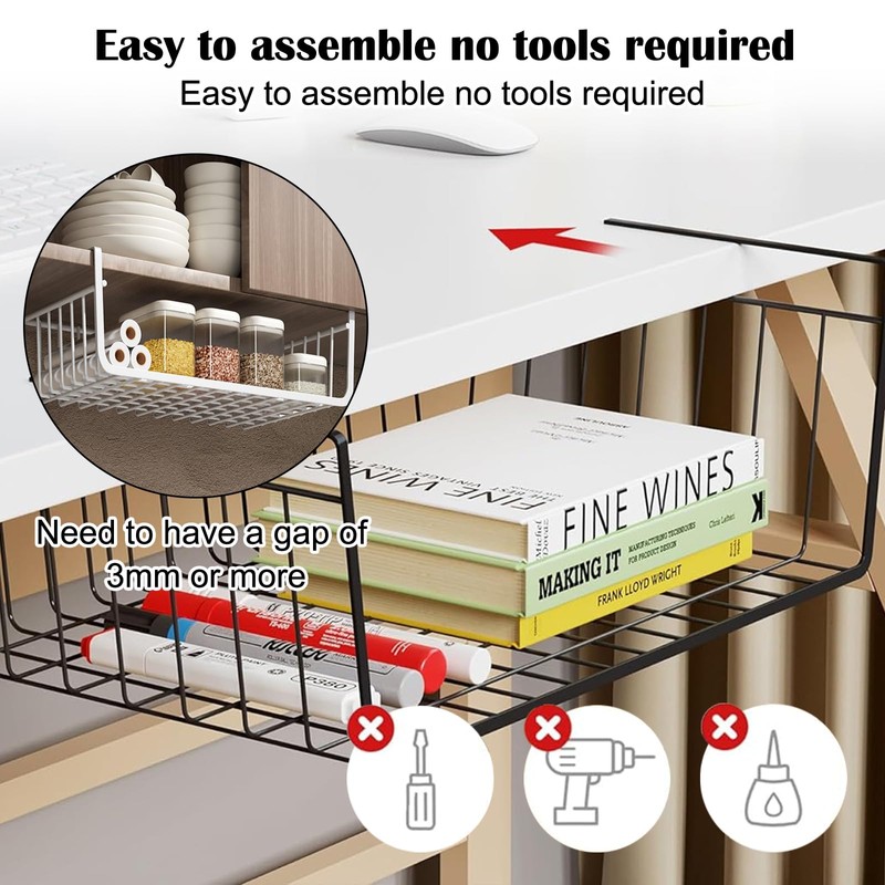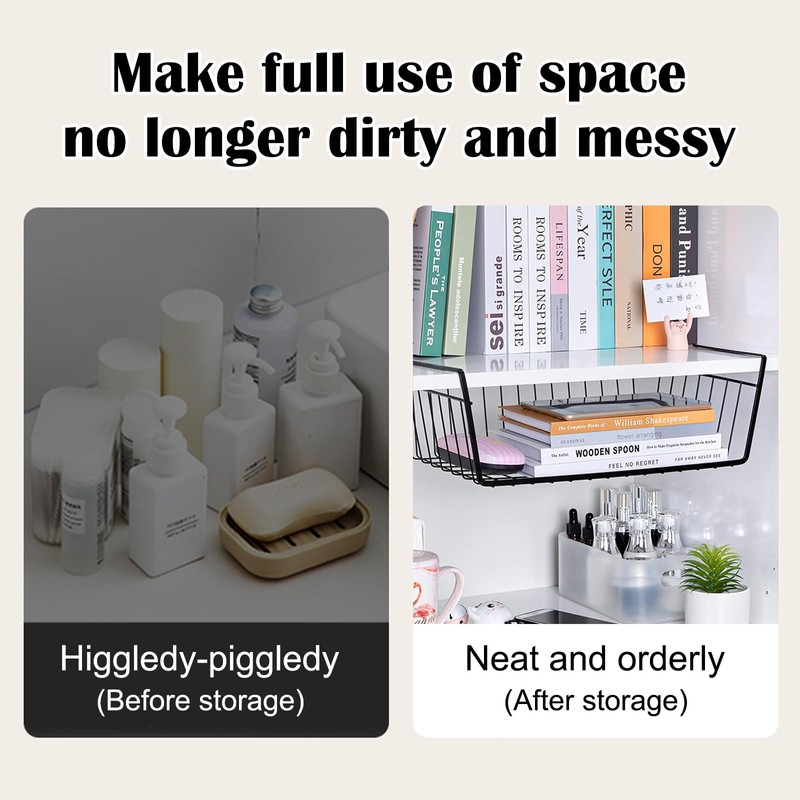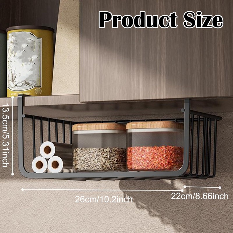 - Easy Install & Use: Under shelf baskets Bidding goodbye to tedious installation procedures, the under cabinet shelf basket organizer requires no installation and is easily installed on the hanging cabinet by hanging. To prevent sliding or scratching surfaces, the baskets are equipped with anti-skid plugs.