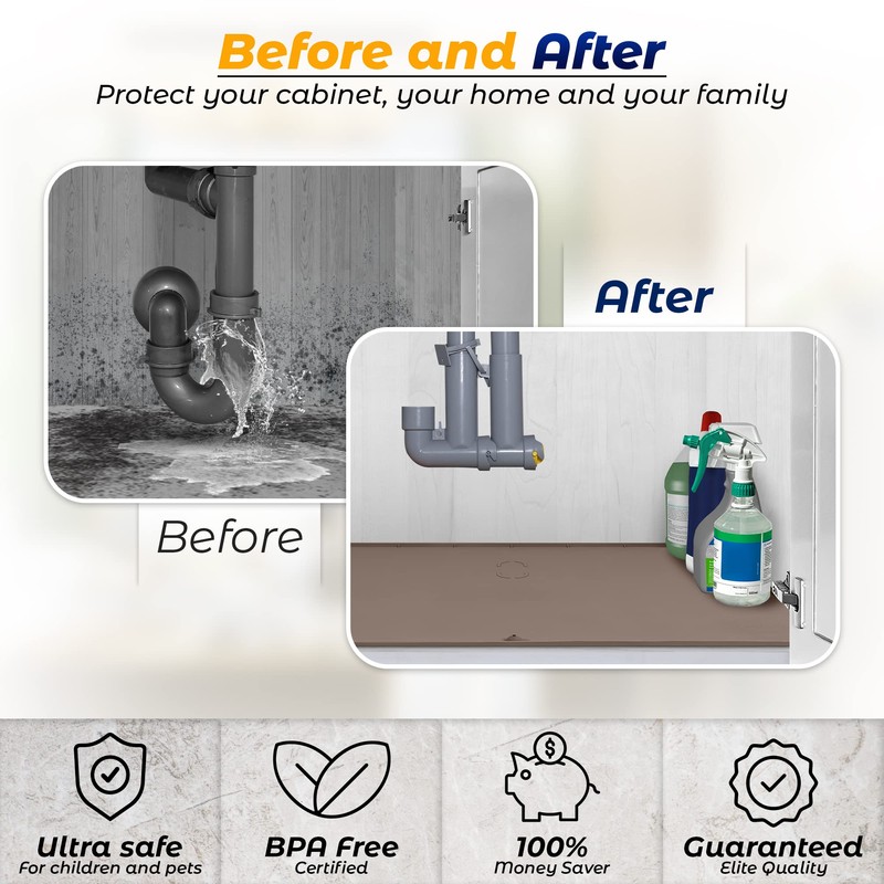 - ✔️ MULTIPURPOSE : Our under sink liners are not only suitable for kitchen cabinets, but also suitable for bathroom cabinets, pets, crafts, and any more occasions to prevent messes and spills!