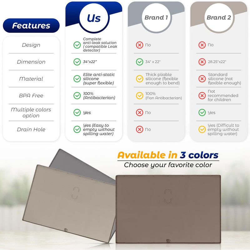 - ✔️ LEAK DETECTOR COMPATIBLE - our under sink mats for kitchen waterproof are a deal for kitchens, bathrooms, or utility rooms. Has mark for placing the Smart Wifi leak detector in the best position to capture any leakage from kitchen sink tray.