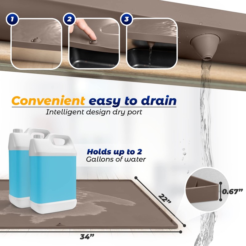 - ✔️ PERFECTLY FITS 36” CABINETS - The size of our under the sink mat is 34'' x 22'', fits standard 36-inch kitchen and bathroom cabinets. The lip of the mat is 0.67" in height, holds up to 2 gallons of water, giving you more time to address a leak.