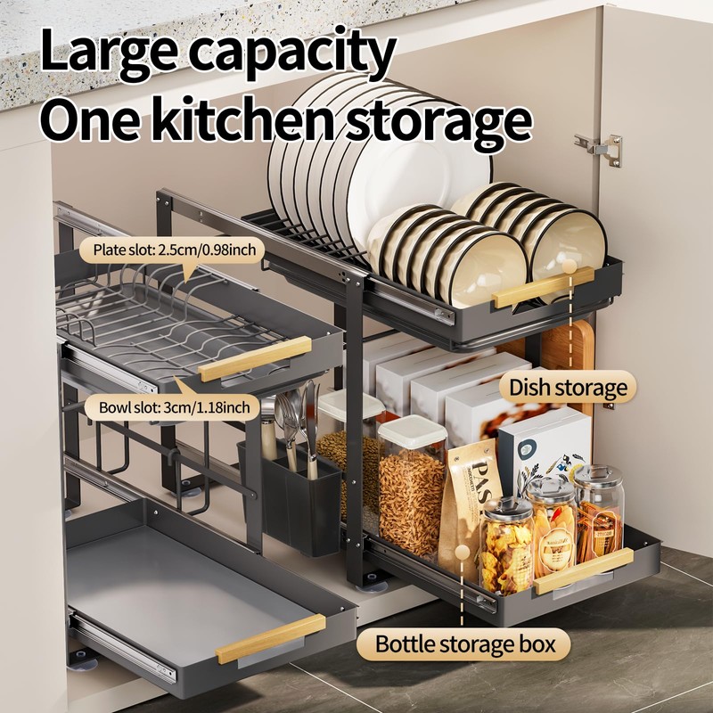 - [2-TIER DISH RACK WITH DUAL FUNCTION STORAGE] This 2 tier dish Drying rack is designed for versatility—use the upper dish holder rack to neatly organize plates and bowls, while the lower sliding spice drawer is ideal for storing condiments, jars, or packaged snacks. A must-have pull out cabinet organizer for compact kitchens.