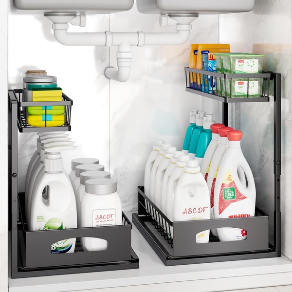 - SECURE & STURDY DESIGN: The lower drawer's high basket fence keeps items secure. Made with thicker metal wires, reinforced with metal plates, and coated in a rust-proof baking paint finish, this under sink organizer prevents bending, resists deformation, and ensures long-lasting durability and stability.