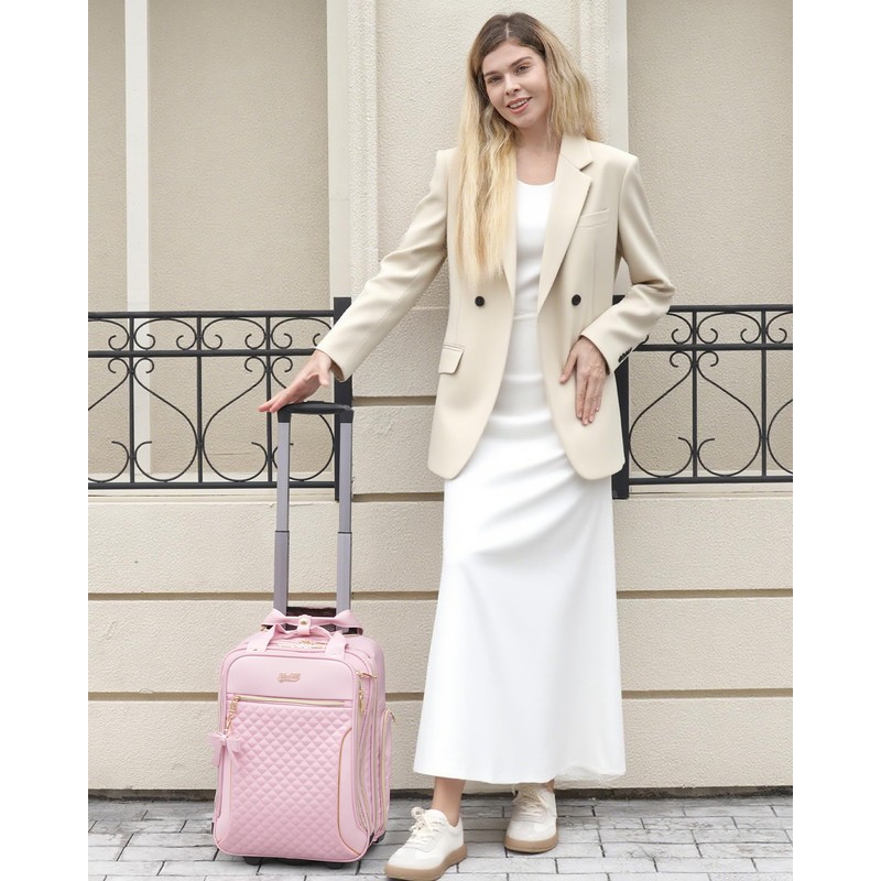 Underseat Carry On Luggage with Wheels, Airline Approved Personal Item Suitcase with Multiple Compartments, Lightweight Softside Under Seat Carry-on Suitcases for Women Travel Business, Pink