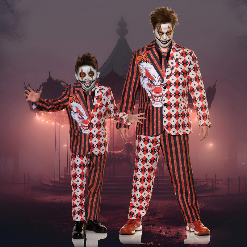 - 🎪 DAPPER & DANGEROUS! Torment Red & White Diamonds Clown Suit fits like a Real Fully-Lined Kids Suit Jacket & Pants! Add a Dress Shirt and Clown Makeup Kit for Added Scares!