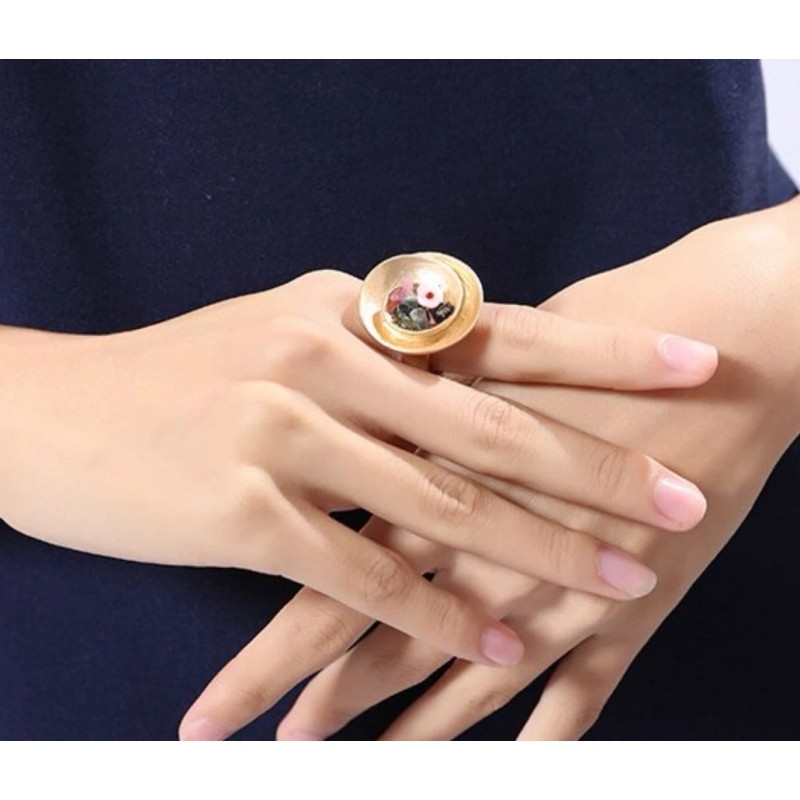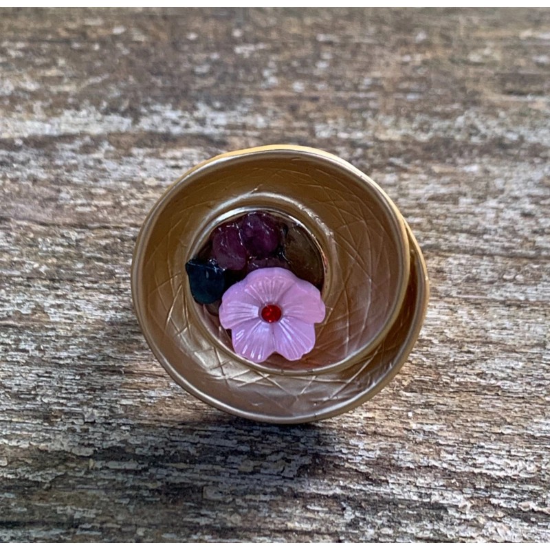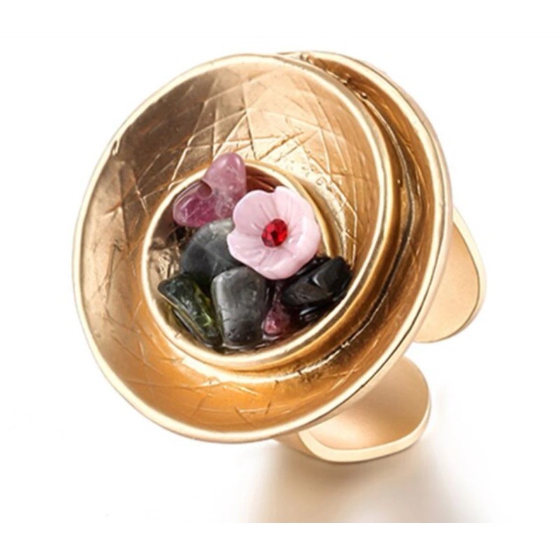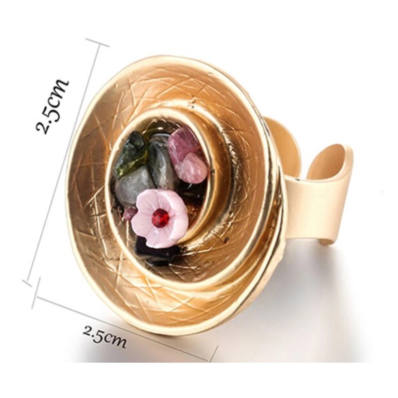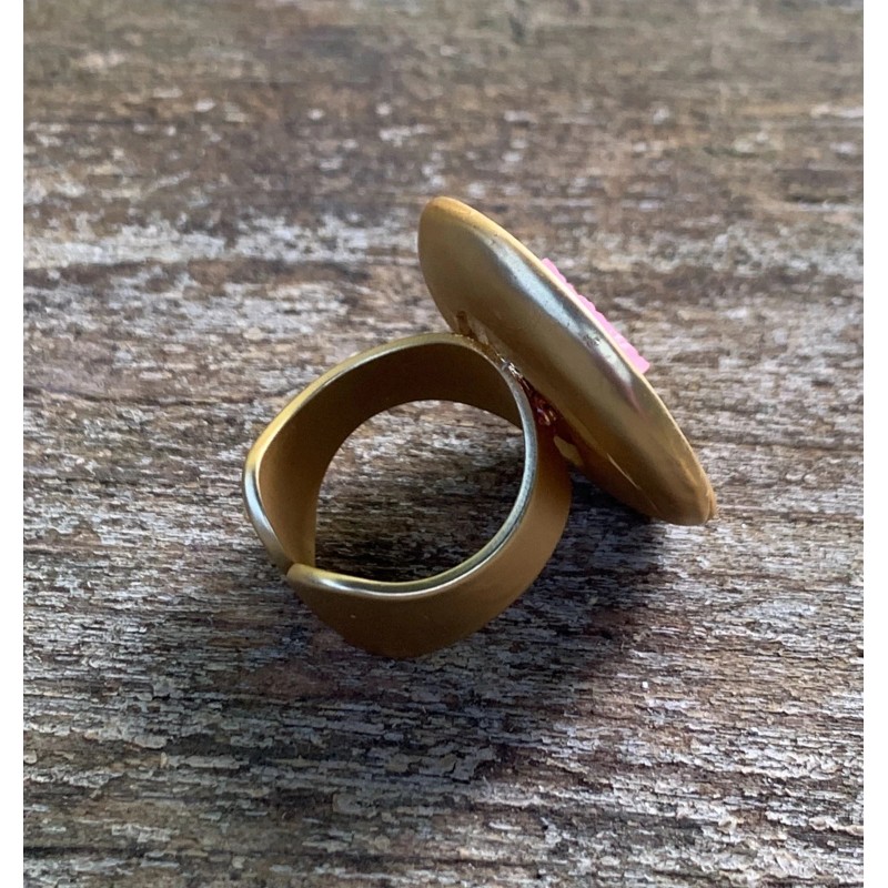 Custom Made Unique Round Gold Tone Ring measures 1 in x 1 in surface size. Metal - Zinc Alloy. Adjustable Band.