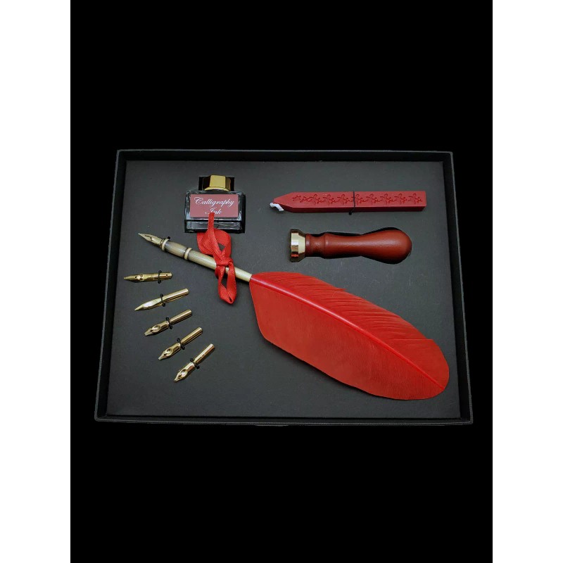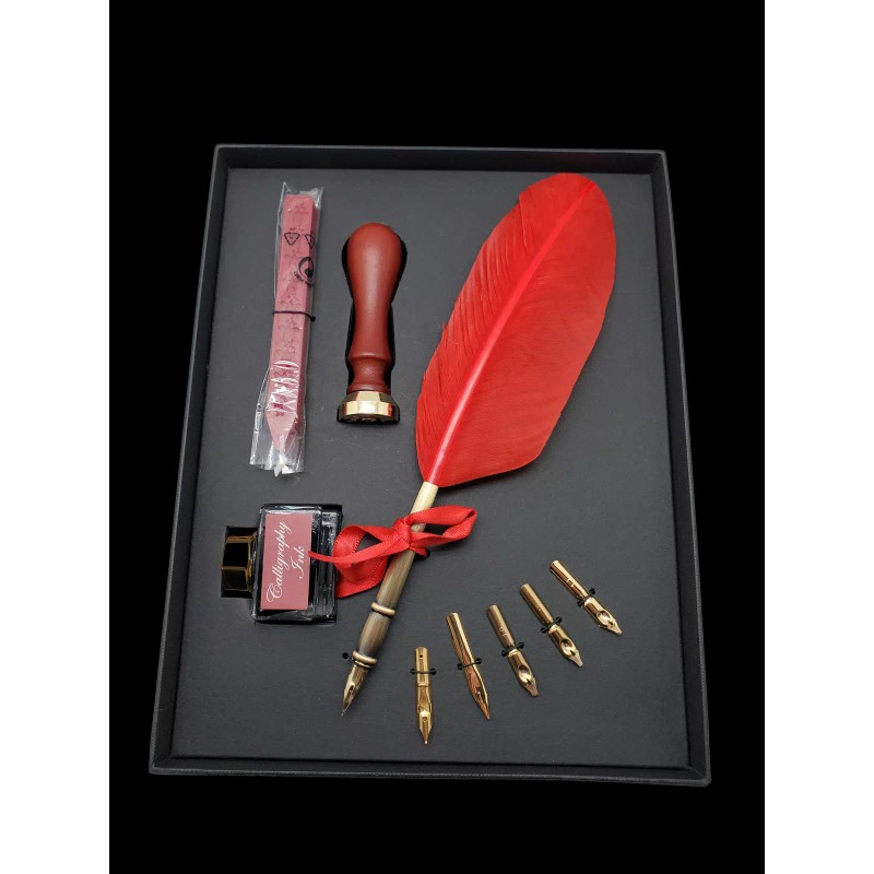 - CONTENTS: A calligraphy quill pen, six calligraphy nibs, one ink bottle with black Austrian ink, 1 red sealing wax, 1 stamp with sun logo