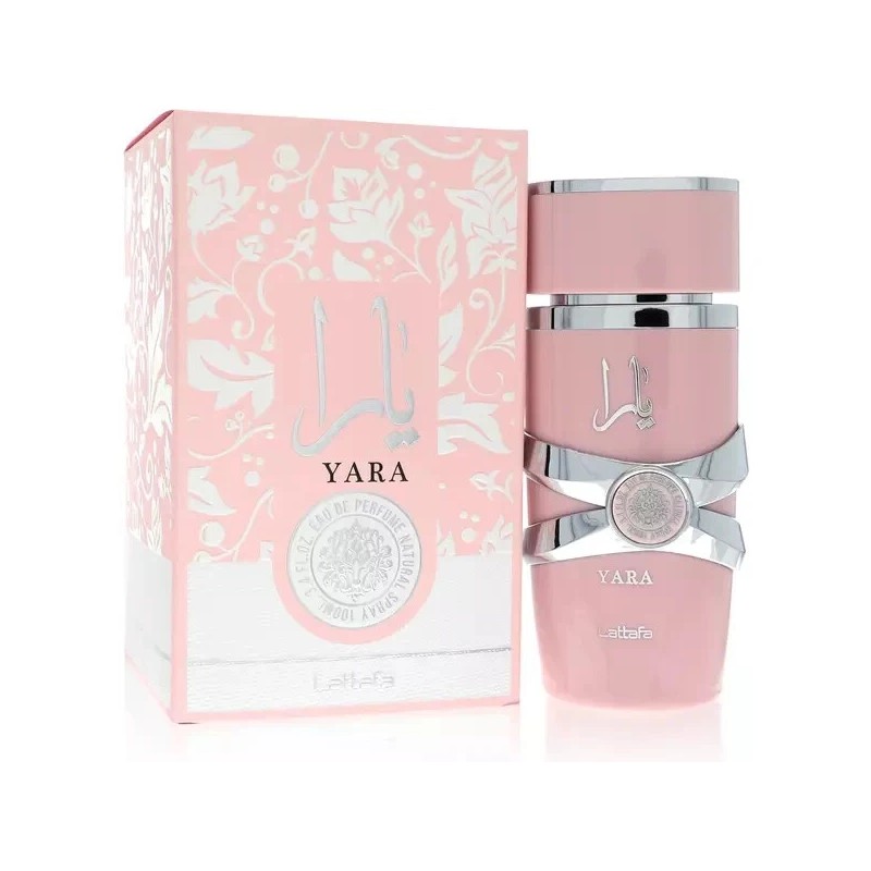 Lattafa Yara Perfume by Lattafa.Top notes are Heliotrope, Orchid and Tangerine; middle notes are Gourmand Accord and Tropical Fruits; base notes are Vanilla, Musk and Sandalwood.All products are original, authentic name brands. We do not sell knockoffs or imitations.